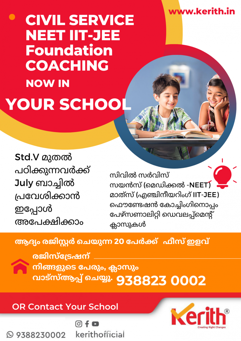 കരിയർ & എൻട്രൻസ് ഫൗണ്ടേഷൻ പ്രോഗ്രാമുകൾ ആരംഭിക്കുന്നു പ്രിയ രക്ഷിതാവെ, NEET, KEAM,CIVIL SERVICE, BANKING, LAW MANAGEMENT, UPSC, KAS ഉൾപ്പടെ വിവിധ എൻട്രൻസ് പരീക്ഷകൾക്കുവേണ്ടി...